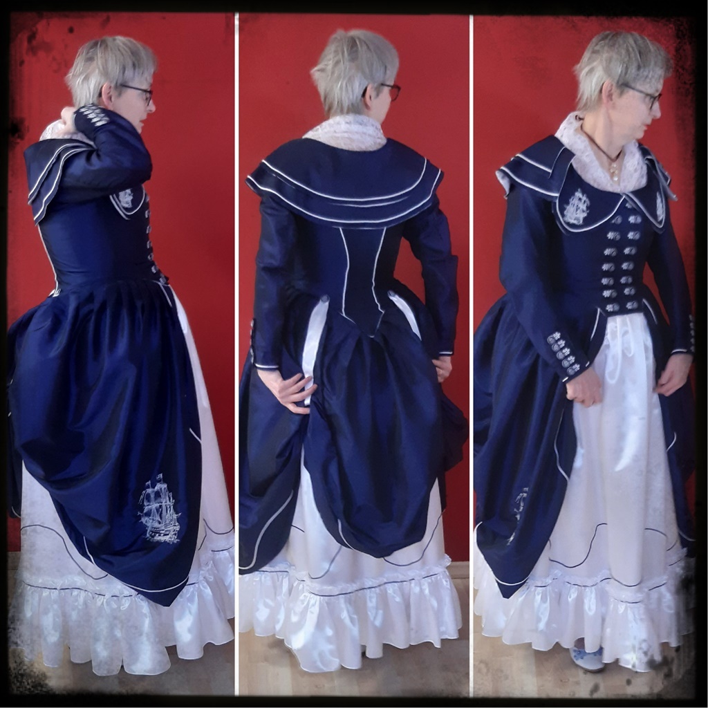 Blaue Redingote aus Taft mit gesticktem Segelschiffmotiv, Anker-Knöpfen und Verzierung mit weißem Soutache-Garn. Die Rockschöße können mit Bändern gerafft werden. Der weiße Satinrock ist mit blauem Soutache-Garn verziert. Zur Formgebung wird ein Pokissen getragen. Ein passender Hut mit dem gleichen Segelschiffmotiv und einer blauen Straußenfeder komplettiert das Ensemble.
