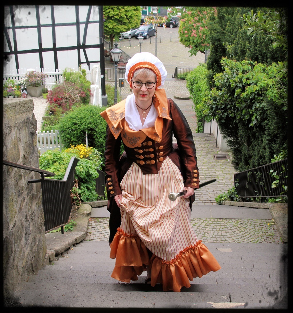 Braune Redingote (Übermantel) aus Taft mit Kragen und Knöpfen in Orange, teilweise bestickt. Weiß-orange gestreifter Baumwollrock mit Rüsche. Um die typische Silhouette zu formen, wird über dem Po ein spezielles Kissen getragen. Eine Haube zur Bedeckung der Haare, ein farblich passender Hut, ein weißes Tuch für den Ausschnitt und ein Spazierstock vervollständigen das Bild. Die Bilder sind rund um den Markt in Solingen-Gräfrath entstanden.