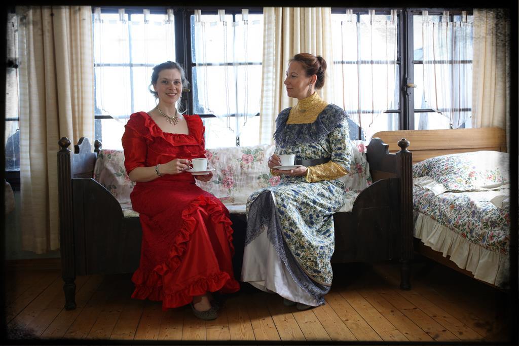 In der Zeit trug die Dame unter dem Kleid eine Spitzenbluse mit Stehkragen. Leider ist die Spitzenbluse noch nicht fertig. Dafür gibt es einen passenden roten Hut mit Straußenfeder und Spitze. Er wird mit einer langen Hutnadel befestigt.