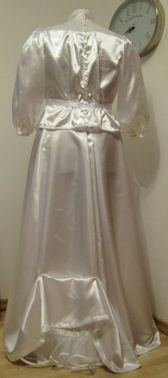 Bestickter Taft, weißer Satin, elastische Spitze, Perlenornament am Revers und der Ärmelkante, Paspeln im Ausschnitt und als Strukturelement, Knopfverschlussleiste im Rücken, eingearbeitetes Taftfutter.